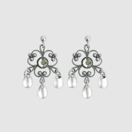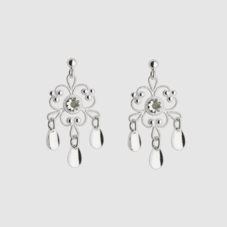 Vakker ørepynt i hvitt sølv med stein i blomsterformet filigrandekor og 3 forgylte dryppløv fra Sylvsmidja på Voss.