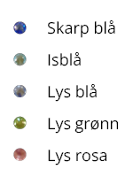 | Farge | Lys rosa, Lys blå, Isblå, Skarp blå, Lys grønn |