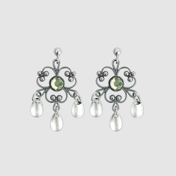 Vakker ørepynt i oksidert sølv med stein i blomsterformet filigrandekor og 3 forgylte dryppløv fra Sylvsmidja på Voss.